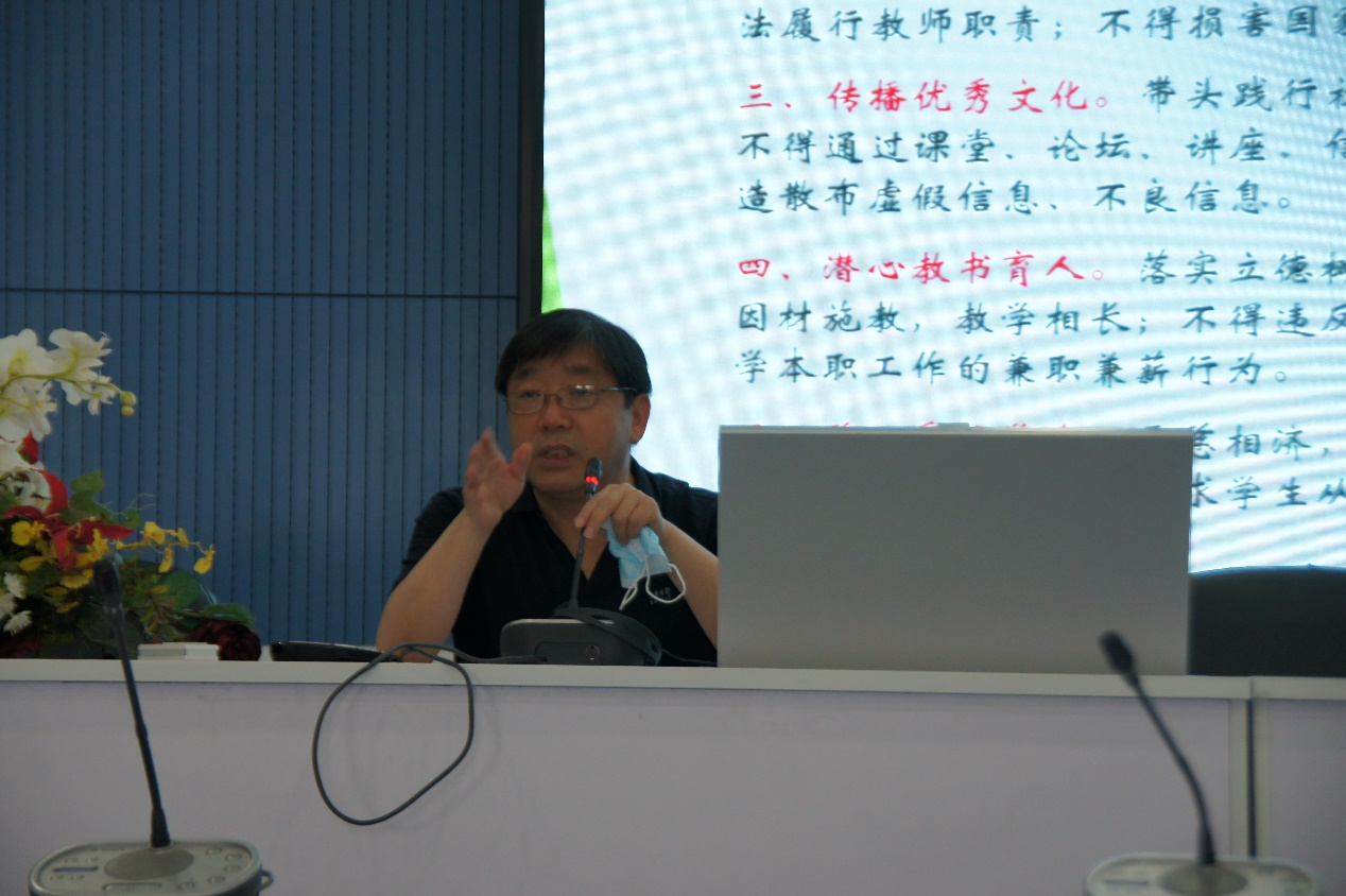 向明友院长对新时代高校教师职业行为十项准则进行深入解读,指出新时代对教师这一职业提出了更高和更严格的要求,传达正确价值观和传播知识是当代教师应尽的职责。向院长强调,广大教职工应坚决贯彻党的教育方针秉持爱国热情依法履行教师职责带头践行社会主义核心价值观,为学生起到正向的引领作用;坚决以教书育人为本职做学生的良师益友;同时举止文明、作风正派严谨治学,处事公道廉洁自律,积极奉献。