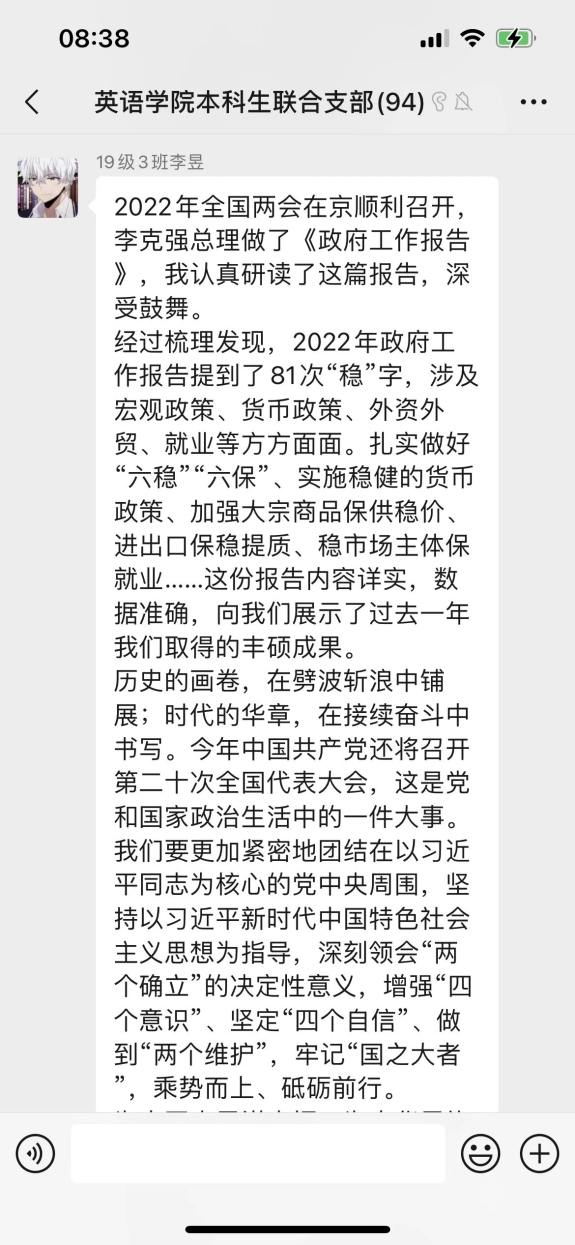 2019级姚可譞:聆听了李克强总理代表国务院所作的《政府工作报告》,深感振奋。总理在报告中提出,“今年我国发展面临的风险挑战明显增多,必须爬坡过坎。越是困难越要坚定信心、越要真抓实干。”“中国经济一定能顶住下行压力,必将行稳致远。”这既是一种豪迈的信心和勇气,也是对全体中国人民提出的战斗总动员令!展示了中国人民传承的不畏艰险,勇往直前的革命意志,同时也给全国人民在经济发展道路上吃了一颗定心丸。作为高校学子,我们更要始终秉持人民底色,积极深入基层,将理论知识融入具体的社会实践当中。
