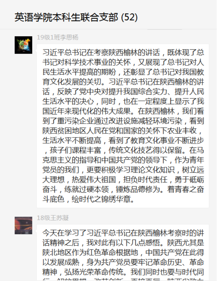 2019级党员兰舒泓谈到,令我印象最深刻的是总书记于绥德实验中学同师生们亲切交流的场景。他表示,要深化教育教学改革,落实立德树人根本任务,厚植爱党、爱国、爱人民、爱社会主义的情感,努力培养德智体美劳全面发展的社会主义建设者和接班人。总书记的谆谆教诲,让我深受教育。我们要深刻领会习近平总书记的重要讲话精神,牢记初心,修身立德、勤学上进,珍惜大好年华,成长为对国家、对人民、对社会有用的人。