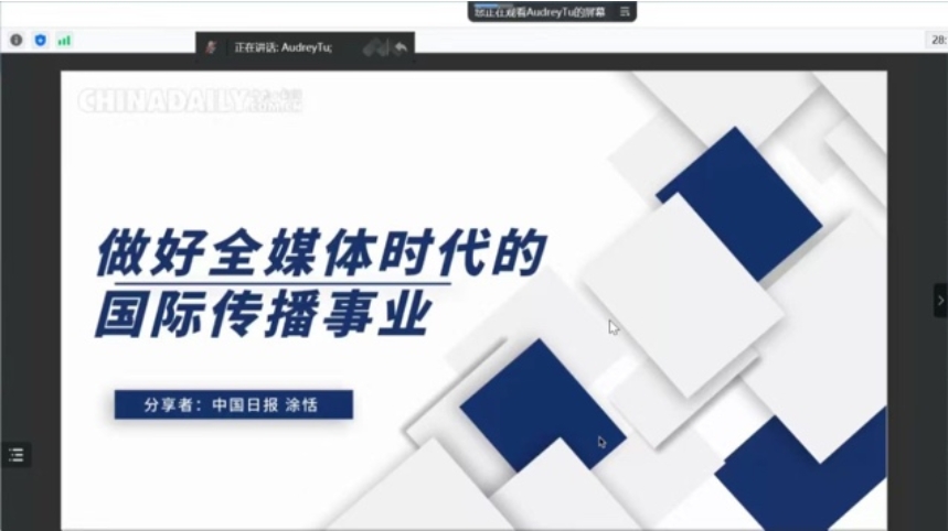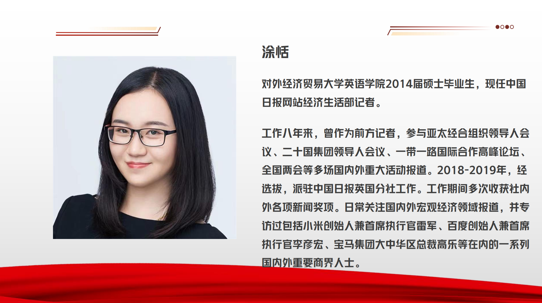 其次,娱乐城送彩金 2014届硕士毕业生、现任中国日报网站经济生活部记者涂恬结合自身工作经历进行“做好全媒体时代的国际传播事业”专题分享。她以一张名为 “习惯性甩锅”的漫画切入主题,为同学们介绍了当前复杂多变的国际环境以及面对西方部分势力打压、抹黑中国的背景,做好国际传播工作的挑战与责任。通过对陈卫华老师(现任中国日报欧盟分社社长)在国际传播工作中精彩案例的分析,同学们了解西方势力对于中国恶意抹黑、歪曲真相的事实,更加坚定一名国际传播者的责任与使命。涂恬分享新闻行业的发展变化趋势,强调“全媒体时代”已经成为大势所趋,舆论生态给媒体格局带来了新的挑战,并基于行业形势提出财经新闻专业同学应具备多领域实习、多技能学习等素质与本领。分享会最后,她希望同学们能够做到“无论将来身处国内国外,请一定记得保持自己的那份初心,爱养育了自己的这片土地,做一个有理想,有信念,也有行动力的人,真正做到习近平总书记所说的‘讲好中国故事,传播好中国声音’”。