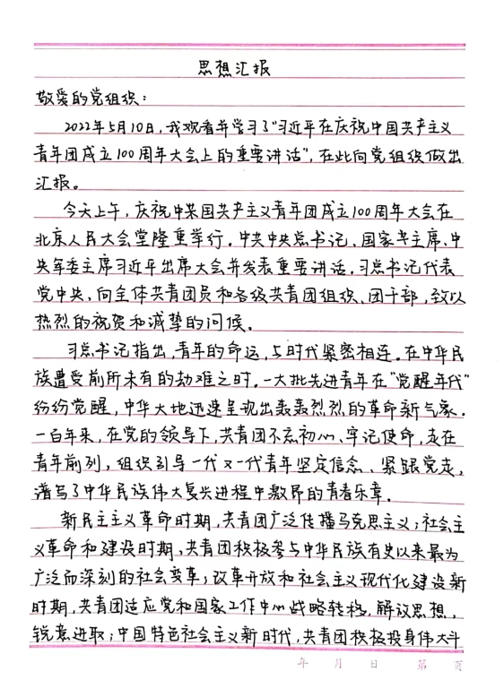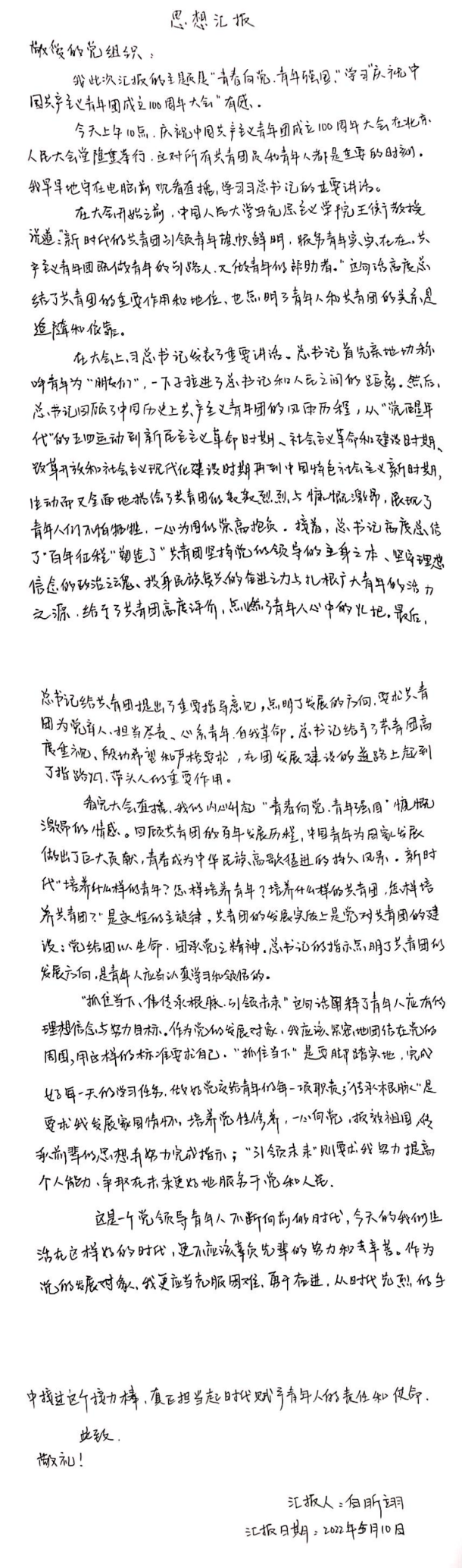 5月10日上午,庆祝中国共产主义青年团成立100周年大会在北京人民大会堂隆重举行,中共中央总书记、国家主席、中央军委主席习近平出席大会并发表重要讲话。娱乐城送彩金 本科生联合党支部党员、发展对象和积极分子通过不同形式收看收听大会实况直播,认真学习习近平总书记在中国共产主义青年团成立100周年大会上的重要讲话精神,并结合学习工作畅谈体会。