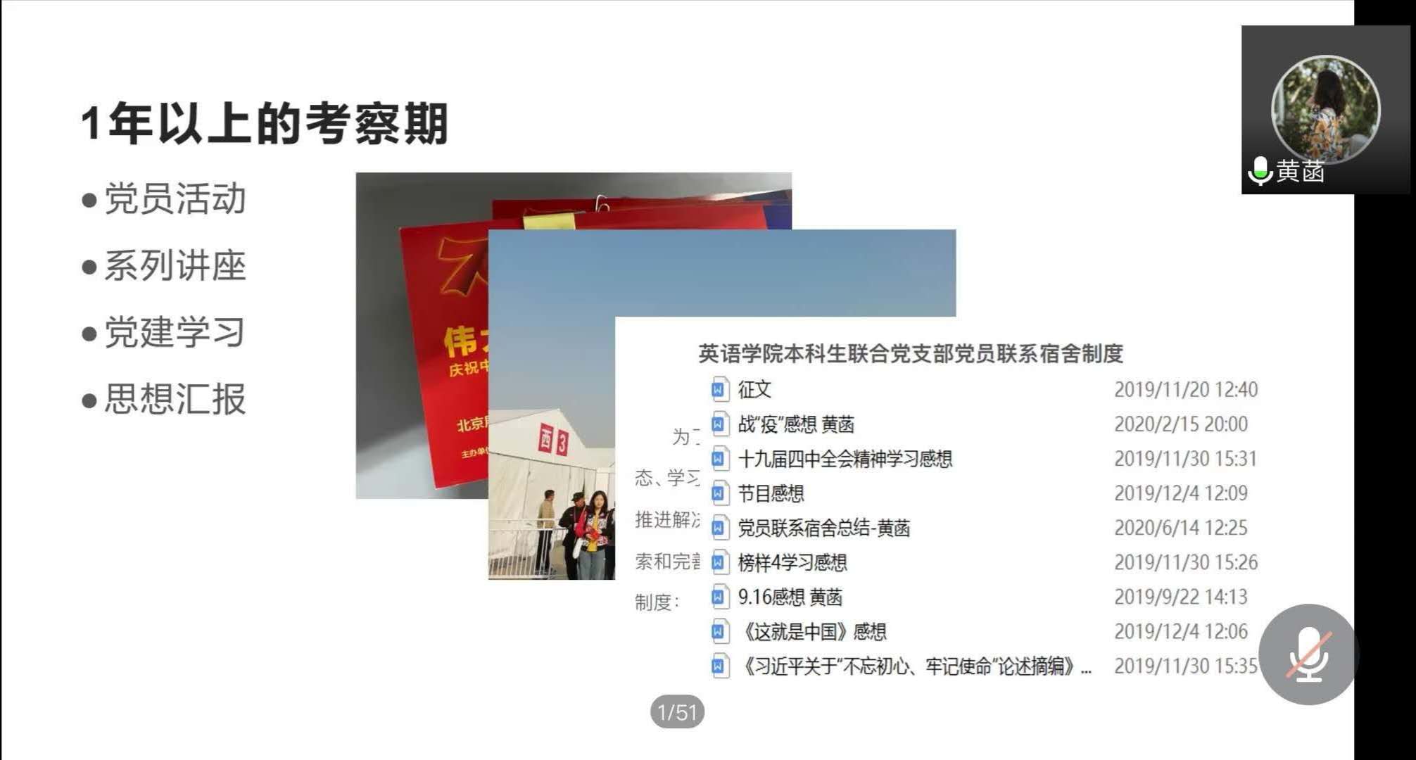 黄菡同学以提问“入党动机”的方式开场,清晰地向同学们介绍了入党的具体流程。同时,她也分享了自己参加2019年建国70周年阅兵仪式经历,带我们回忆了70周年阅兵盛况。从讲座中同学们加深了对入党的认识,坚定了听党话跟党走的道路,希望跟随黄菡学姐的脚步,做新时代积极健康向上的大学生。