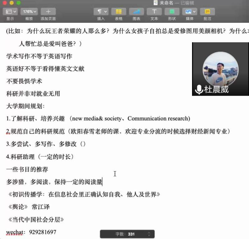 杜晨威同学从个人科研经验入手,为同学们讲解了什么是科研学术——用理论去解释世界 ,并介绍了大学本科科研实践规划和参考路径,在培养科研兴趣、科研规范和尝试写作等方面给出了个人建议。最后他还为同学们推荐了财经新闻方面的书籍,也通过个人科研经历,强调了阅读的重要性。欧阳修有言:“立身以立学为本,立学以读书为本。”诚如斯言,阅读在我们大学学习乃至整个人生道路中都是至关重要的。