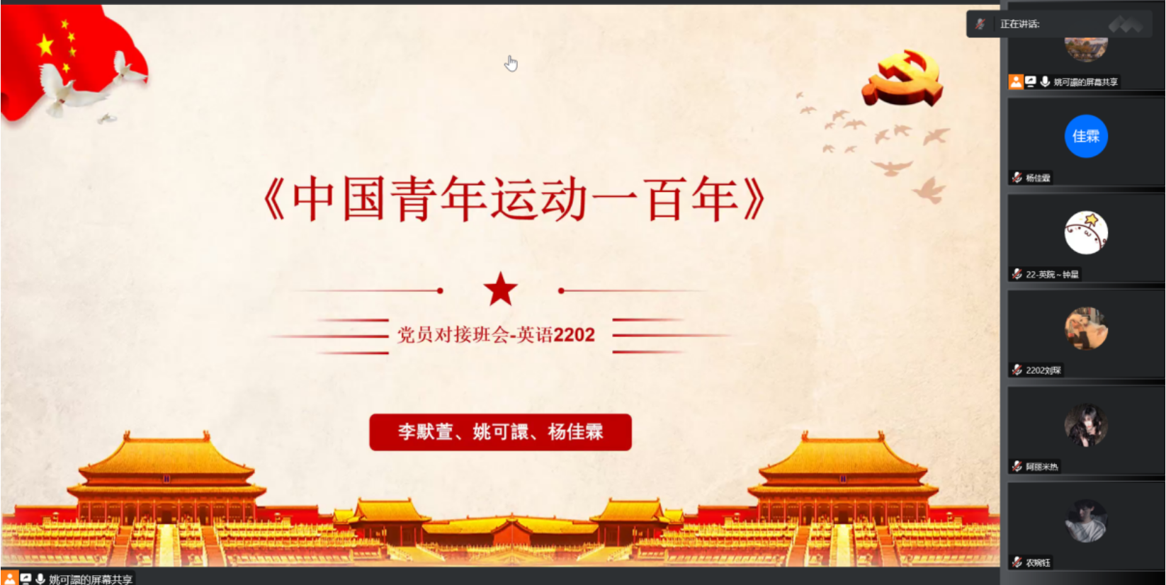 10月6日下午,英语2202班全体同学通过腾讯会议举办了线上“团支部党团主题阅读分享会”。在19级三位预备党员、党员的带领主持下,同学们深入学习了《中国青年运动一百年》一书中重点章节的内容,并积极参与讨论。