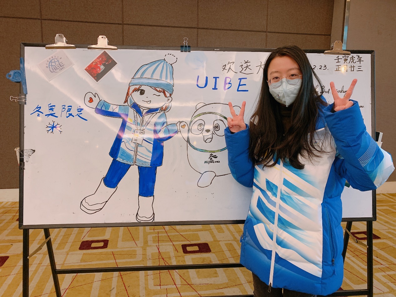 刘心语、马冰睿、袁嘉逸、崔诗雨等11位志愿者服务于北京冬奥村,分散于场馆礼宾以及语言服务两个岗位。志愿工作包括运动员与外宾的日常接待与业务协调,旗帜、壁画的运营管理以及各项口译、笔译服务等。
