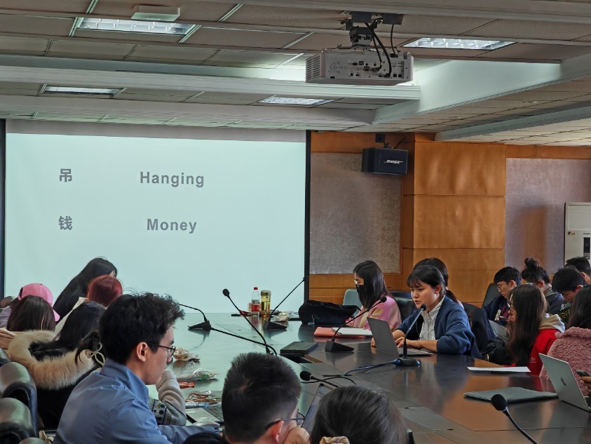 随后,娱乐城送彩金 2023级刘哲含同学对“吊钱”这一传统剪纸艺术进行了分享。刘同学从吊钱的英文释义出发,向同学们介绍了吊钱的文化内涵和现代应用。“吊钱”一般为一张雕刻有花纹图案的长方红纸,下似“流苏”,因能烘托节日气氛而广受欢迎。