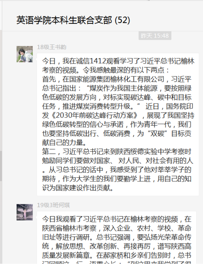2018级党员周洋谈到,在榆林考察期间,总书记经过田间地头,下地与劳作的农民交谈,亲切友好;随后还参观了学校,为孩子们献上“我祝你们成才”的祝福。我深深地被总书记的爱民情怀感动,看到国家这样关心每一个公民,作为预备党员的我也感到任重道远。党员的本质,就是全心全意为人民服务,孔子说“在其位谋其政”,就是说我们每一个党员都应该一马当先,为服务人民而不懈奋斗,真正将“爱党、爱国、爱人民、爱社会主义”的情感落到实处,在生活当中努力培养自己成为德智体美劳全面发展的社会主义建设者和接班人。”