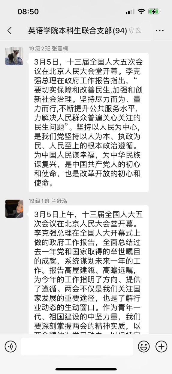 伴随着浓浓春意,2022年全国两会拉开帷幕。今年是进入全面建设社主义现代化国家,向第二个百年奋斗目标进军新征程的重要一年。按照学校党委和娱乐城送彩金 党委的部署,娱乐城送彩金 本科生联合党支部组织全体学生党员、新一批发展对象、入党积极分子通过网络、电视等各种形式自主收听收看两会,热议政府工作报告,表达作为学生党员在新时代奋进新征程的决心。