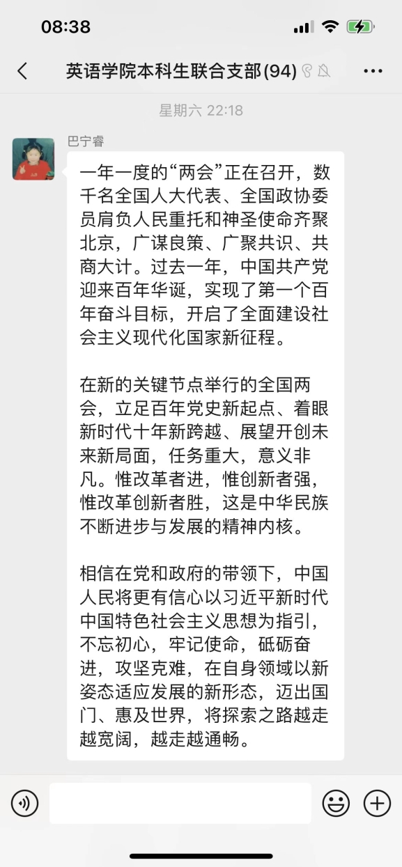 2018级黄思予:2022年全国“两会”,教育理念和思路得到了进一步拓宽,教育公平与质量提升得到进一步强调。政府工作报告指出,“要坚持把教育这一事关千家万户和中华民族未来的大事办好”。教育公平是体现我党带领人民逐步实现共同富裕的过程,在教育资源配置上实现均衡化发展并推动城乡一体化,这一举措关系到地区的发展,具有十分重要的意义。作为青年党员,我们也应积极投身实现教育公平的事业中去,支持乡村地区教育事业的发展,为教育事业贡献自己的力量。