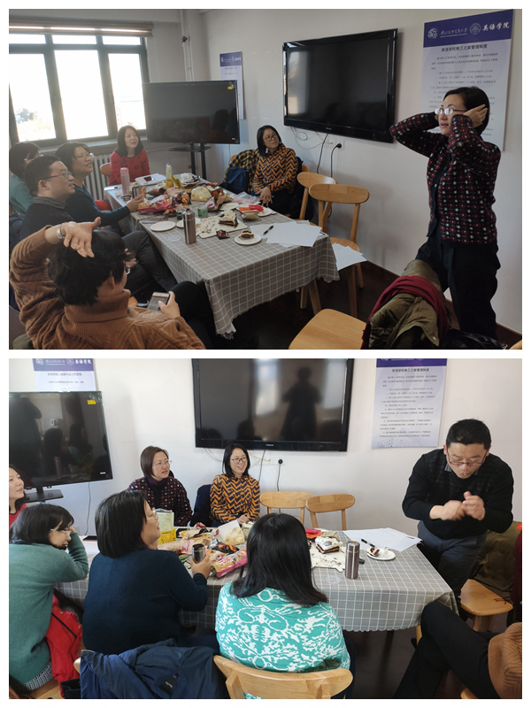 同一天的下午一点,英语文学学系也在诚信楼1402教工之家举办“辞旧岁迎新年”联欢会活动。全体教师均准时到场,他们的趣味活动是“猜字谜”的游戏,学系老师分成两组。首先出场的胡振明老师,他的动作和表情将“东张西望”“回眸一笑”等演绎得惟妙惟肖,其他老师很快猜出。但在“饺子”这道看似平常的题目上,胡老师却遇到了麻烦,直到演示出“擀皮”的动作,才有老师猜出。第二组出场的李铭老师表现力超群,无论是“茶叶蛋”、“煎饼果子”等食品还是“画饼充饥”“掩耳盗铃”等抽象的成语,李老师表演得十分贴切。赢得了阵阵掌声。持续近两小时的联欢会在愉悦融洽的氛围中圆满结束。