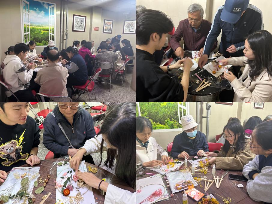 学生支部精心为老党员们选择了“手工团扇”作为制作活动主题,老党员们热情地招呼同学们坐在一起,大家两两结伴共同完成手工。在同学们的帮助与辅佐下,老党员们在空白团扇上悉心布局,将品种丰富的干花搭配组合再粘贴其上,制作出了风格各异且独一无二的美丽团扇。新老同志们相互合作,相得益彰,制作过程中欢声笑语不断,氛围中满满洋溢着温暖与亲切。感情升温的同时,支部之间的情谊也得到了进一步的升华。