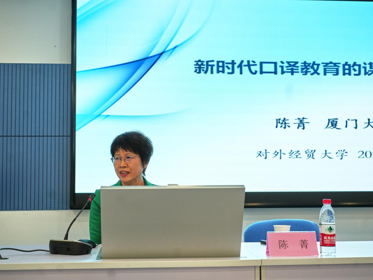 2024年11月1日下午15:30,厦门大学外文娱乐城送彩金 院长陈菁教授应邀来到对外经济贸易大学作“新时代口译教育的谋势与求变”专题讲座。讲座于诚信楼1412会议室进行,由娱乐城送彩金 副院长陈功教授主持。外语娱乐城送彩金 郝君峰副院长、英语和外语娱乐城送彩金 翻译方向师生近100人参加活动。两院口译方向研究生为讲座做同声传译。