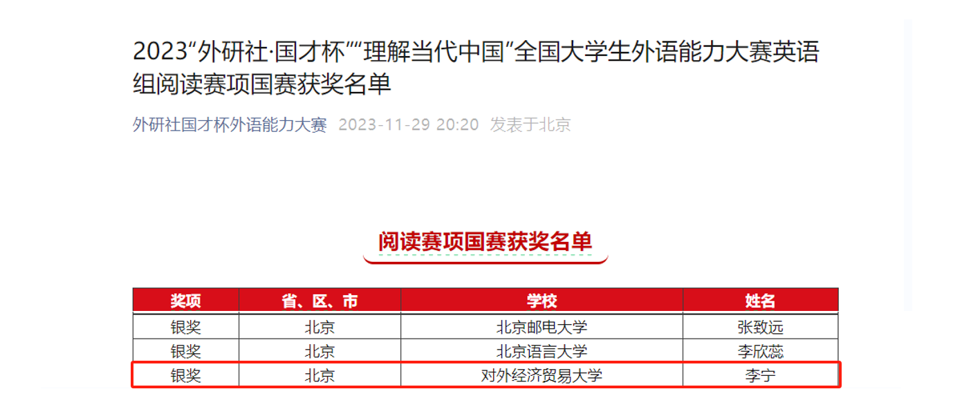 11月25—26日,2023“外研社·国才杯”“理解当代中国”全国大学生外语能力大赛(英语组)国赛阅读、写作、口译赛项第一阶段在线上举办,我校学子在多个项目比赛中荣获佳绩。