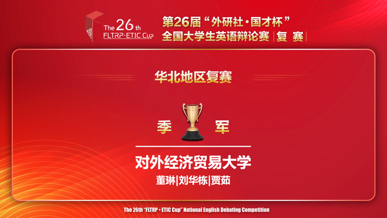 2024年3月31日,对外经济贸易大学英语辩论队(指导老师:董琳;选手:刘华栋、贾茹)在第26届“外研社·国才杯”全国大学生英语辩论赛华北地区复赛中,从88支队伍中脱颖而出,荣获季军,并成功晋级全国决赛。这是贸大英语辩论队继去年获得华北赛区一等奖后又一次实力展示,也是娱乐城送彩金
