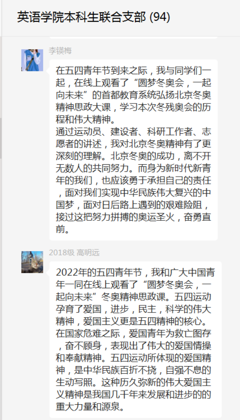 2018级党员吴诚辉谈到,五四青年节之际,我与大家一同学习了人民网面向广大青年推出的“圆梦冬奥会一起向未来”的思政大课。我深刻体会到,成功举办冬奥会和冬残奥会,源于中国经验的厚积薄发。从提出“简约、安全、精彩”的办赛要求,到践行“急难险重任务,我在第一线”的誓言,再到社会各界和人民群众热情参与……北京冬奥会、冬残奥会能够取得成功,靠的是我国持续快速增强的综合国力,靠的是集中力量办大事的制度优势,靠的是全国各族人民的团结奋斗。事实证明,坚持党的集中统一领导,坚持集中力量办大事,坚持主动防范应对各种风险挑战,坚持办赛和服务人民、促进发展相结合,我们就一定能够战胜前进道路上的任何艰难险阻,就一定能够办成我们想办的任何事情。